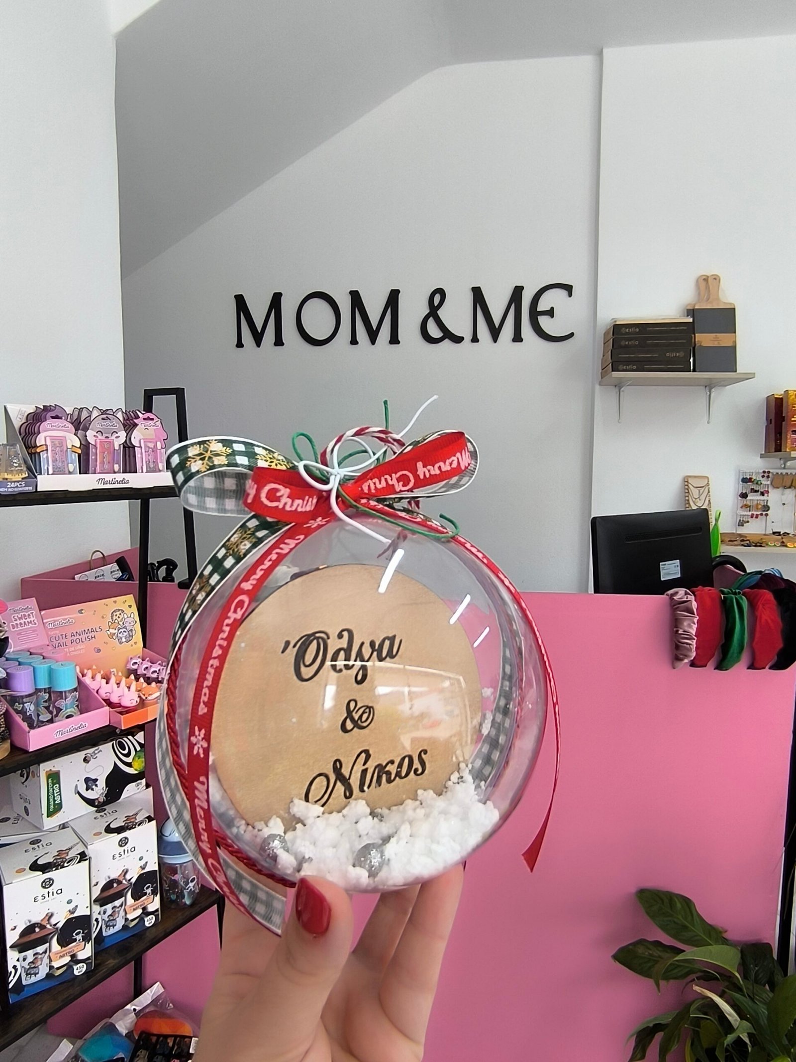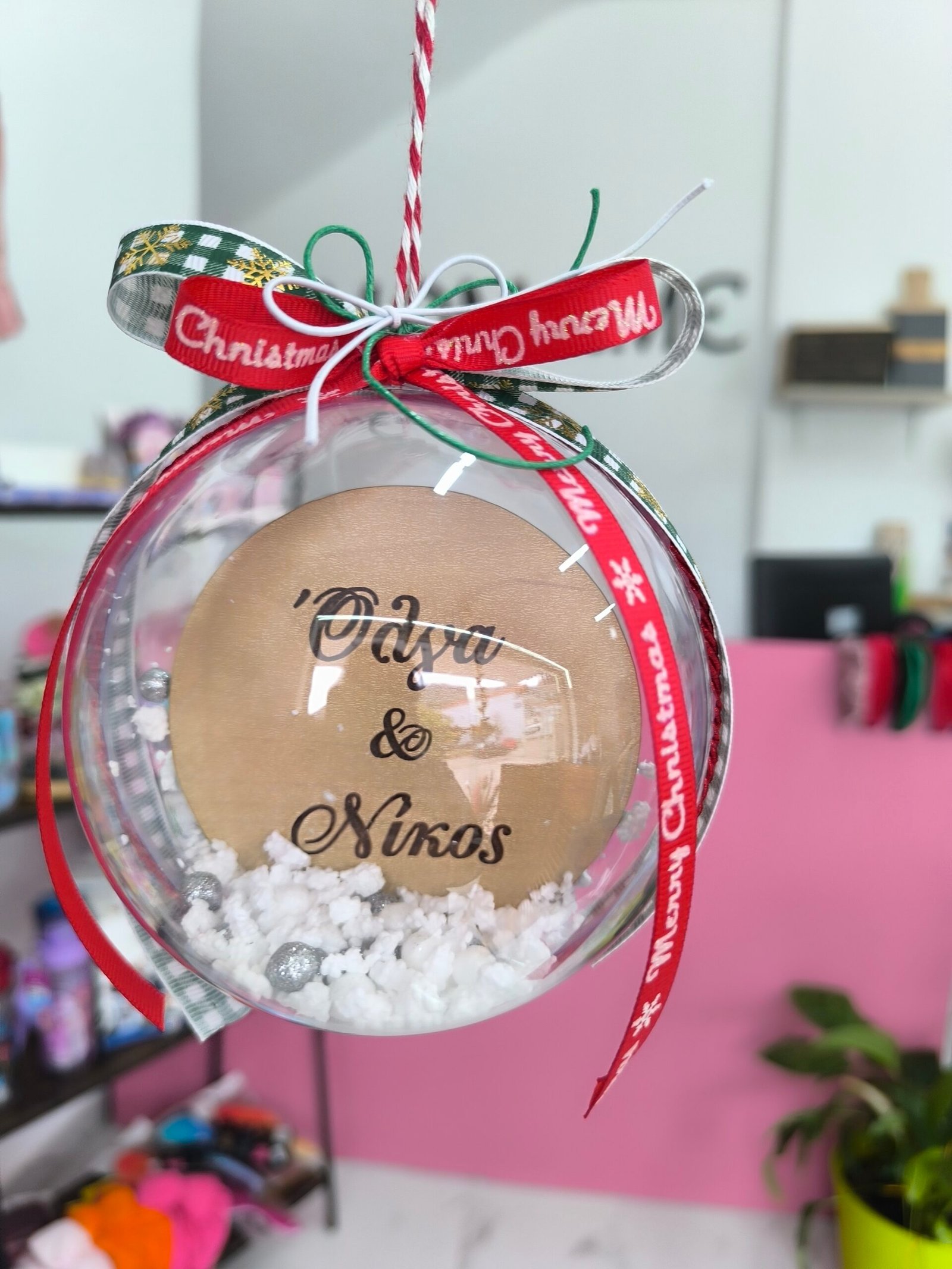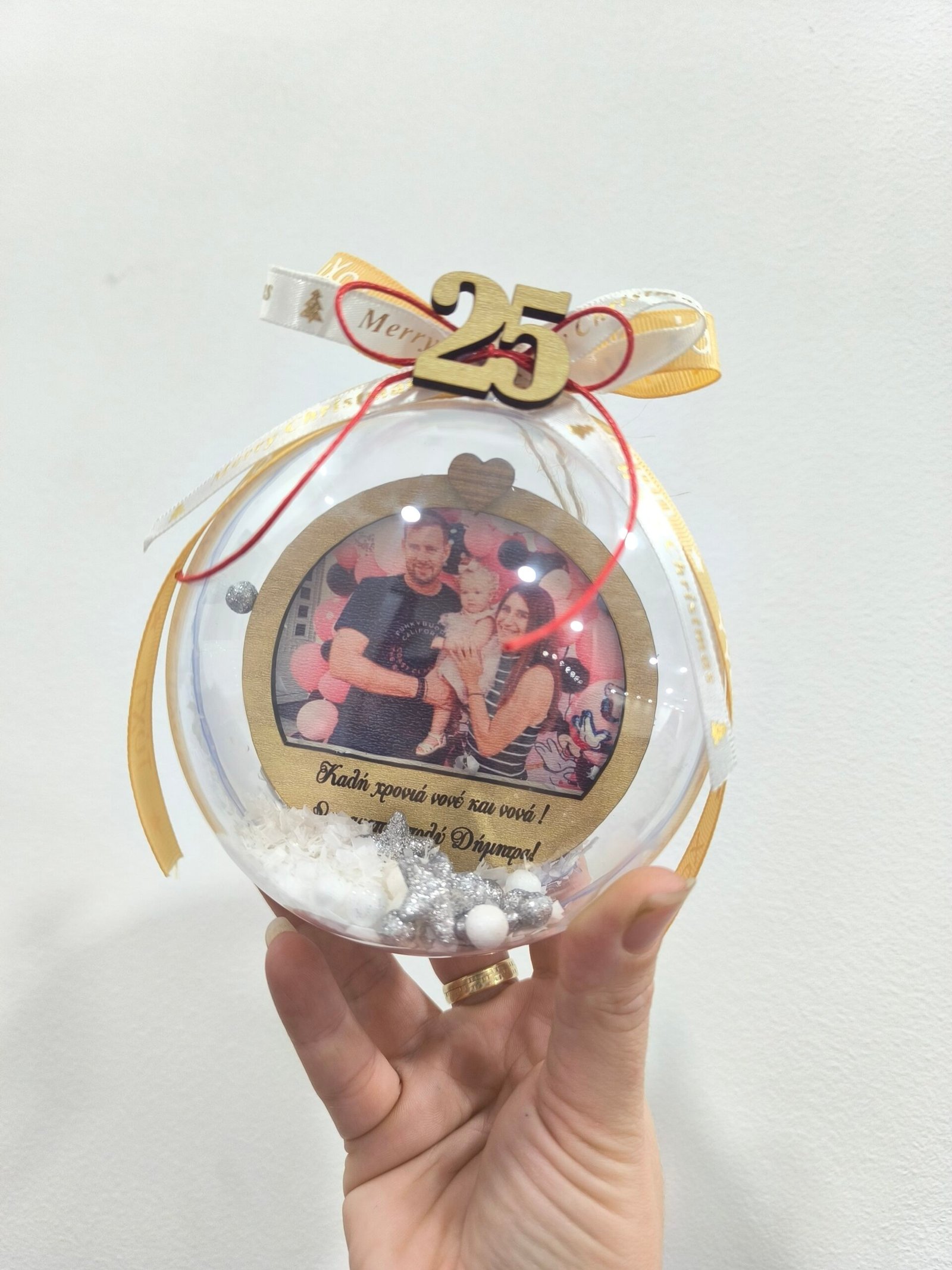 Η μπαλα ειναι γεματι χιονι και διαφορα διακοσμητικα.
